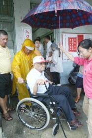 2006-06-10不少里民們穿著雨衣或是撐傘前往投票。(記者林文煌攝) |